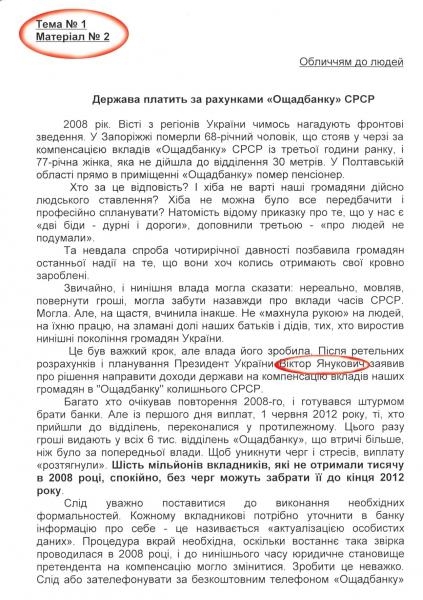 "Мы хотим, чтобы люди узнали о выплате тысячи Сбербанком, о доступном жилье. Собственно такие будут материалы - Сбербанк, пенсия, доступное жилье. Партию регионов ни разу не вспомнят. В тексте должно быть только слово "президент". Мы до парламентских выборов не имеем никакого отношения. Это проект до 2016 года. Если начнем с вами работать, еженедельно в вашей газете должны разместить материалы. Это - проект под следующие президентские выборы", - пояснил Назар Мазур.