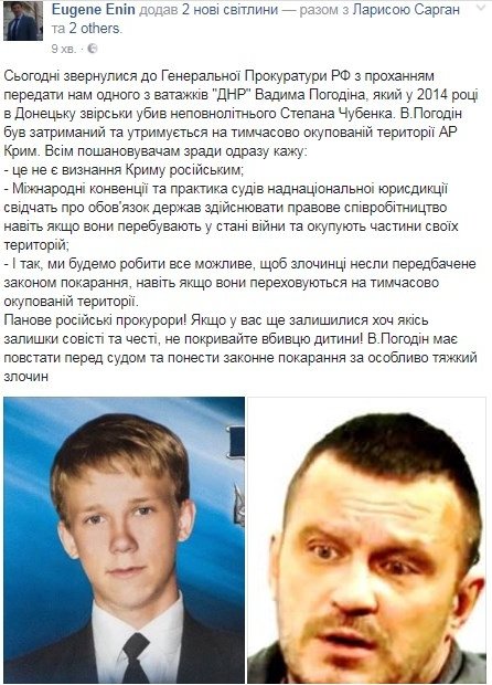Генеральная прокуратура Украины обратилась к Генпрокуратуре РФ с просьбой передать одного из главарей ДНР Вадима Погодина. Именно он в 2014 году в Донецке зверски убил несовершеннолетнего Степана Чубенко. Об этом на своей странице в Facebook написал заместитель генерального прокурора Евгений Енин.