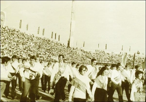 Местная газета "Комсомолец Полтавщины" за 1987 год пишет: "50 лет назад Полтава только стала областным центром. В ней проживало 130 тысяч человек. А теперь — 308 тысяч, более 70 национальностей, — говорит первый секретарь городского комитета Компартии Александр Кива в поздравительном слове на вечернем праздничном концерте на стадионе "Колос". Во время развлекательной программы свое умение показывали велогонщики, дзюдоисты, боксеры. Демонстрировали летние модели одежды, выступал ансамбль песни и танца "Грация", украинский народный хор "Калина". Исполнителей не называли. Зрители постоянно перешептывались: "А кто это?".