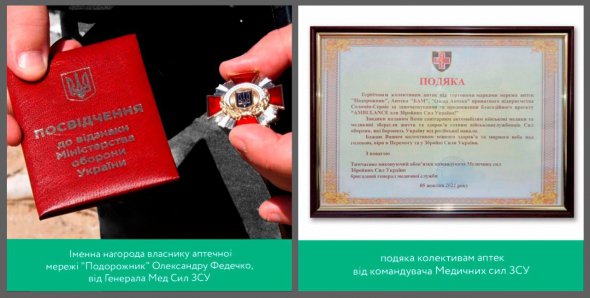 В октябре коллектив аптек получил благодарность за начало и продолжение проекта "AMBULANCE для ЗСУ" и помощь военным медикам, а владелец компании Александр Федечко был отмечен именной наградой от и.о. командующего Медицинскими силами ВСУ.