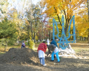 Рекордный национальный герб Украины разместили в винницком военном клиническом госпитале инвалидов войны при входе на территорию. Рядом несколько женщин разгребают землю. От постамента прокладывают дорожки из плитки.