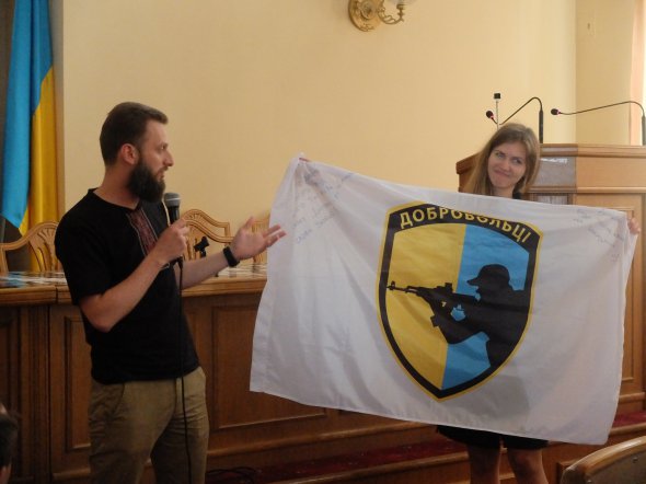 На презентацию приехали студенты военной академии и бойцы АТО - герои видеороликов. Они рассказывали каждый о своем уникальном пути к войне, потере друзей на передовой и общей мечте - вернуться домой - в украинский Донбасс.