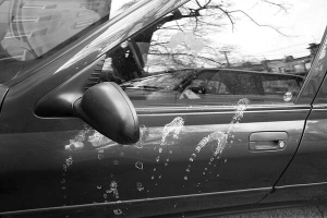 — В пятницу утром вышел к машине и обалдел: краска на дверцах покрыта белыми пятнами, — рассказывает 34-летний Александр. — Сначала подумал, что это голуби. Присмотрелся — краску разъело до металла. Пошел по ряду припаркованных машин. На всех такие пятна. У кого на дверцах, у кого на крыше, кому на стекло попало. 20 машин.