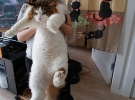 Владелец питомца, музыкальный продюсер, рассказывает, что Самсон отлично приносит предметы, ходит за ним из комнаты в комнату и часто ложится рядом с ним, совсем как собака.