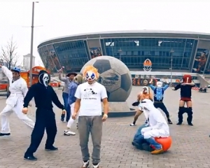 У южного входа в Донбасс-Арену ребята в странных костюмах устроили флешмоб под популярную в интернете песню Harlem Shake. Этот вид флешмоба становится все более популярным среди молодежи во всем мире.