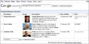 При вводе в Squared запроса "президент Российской Федерации", в поисковой выдаче присутствуют лишь Борис Ельцин и Дмитрий Медведев. При этом в колонке "Дата смерти" напротив фамилии Медведева стоит 20 мая.