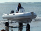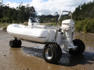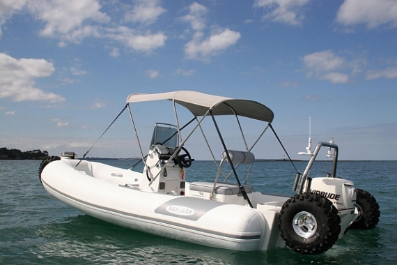 Жёсткая надувная лодка Sealegs, как обозначают своё детище создатели, ездит практически везде. На суше 7-метровая алюминиевая красавица (есть и 6-метровая модель) встаёт на три 63-сантиметровых колеса, обутых в вездеходные покрышки. Каждое колесо имеет собственный гидравлический мотор в дополнение к бортовому движку мощностью в 24 лошадиные силы, который обеспечивает поток рабочей жидкости.