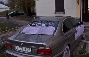 После этого маляры при помощи валиков на длинных ручках перекрасили темную машину в розовый цвет и нанесли крупную нецензурную надпись на заднее стекло, активно привлекая к себе внимание горожан и предлагая поучаствовать в этой "акции" случайным прохожим.