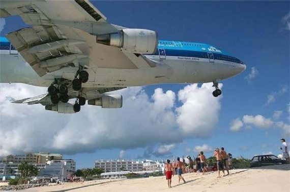 Аэропорт расположился на острове Святого Мартина, а торец взлётно-посадочной полосы аэропорта расположен прямо на морском берегу и вплотную прилегает к пляжу Махо, так что воздушные суда при заходе на посадку пролетают на высоте 10–20 метров над головами туристов, отдыхающих на пляже, пишет unnatural.ru.