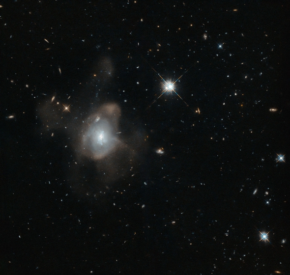 Галактика расположена в созвездии Геркулеса на расстоянии примерно 613 миллионов световых лет, является ярким примером последних этапов этого процесса. Она уже полностью слилась с другой галактикой и пережила вспышку сверхинтенсивного звездообразования, которая всегда возникает в сталкивающихся галактиках в результате сжатия и перемешивания их газа.
