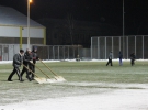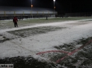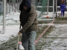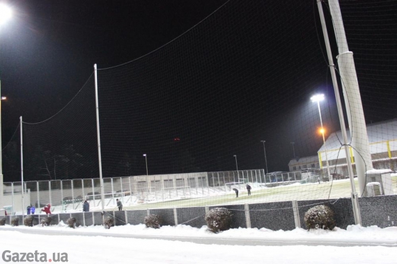 Перед выходом футболистов на тренировочное поле работники лопатами очищают газон от снега. Разметку обозначают розовым. Игроки от холода спасаются шапками, перчатками и шарфами, которые закрывают половину лица. Все находятся в хорошем настроении.