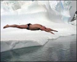 В 2007 году Пью уже устроил километровый заплыв на Северном полюсе, пробыв около 19 минут в воде температурой -1,8 градуса по Цельсию - это рекордно холодная вода, в которой когда-либо находился человек.