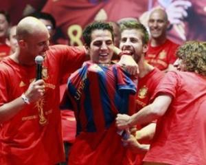 Каталонские защитники "Барсы" Карлес Пуйоль и Херард Пике надели на лидера лондонского "Арсенала" футболку "Барселоны", а Пепе Рейна объявил Фабрегаса не только будущим Испании, но и каталонского клуба.