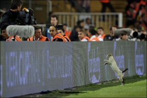 Напомним, что во время финального матча Кубка УЕФА "Шахтер" - "Вердер", вокруг поля разгуливала бездомная кошка. Многие украинские фанаты уверены, что именно "усатый-полосатый" принес их любимому клубу удачу.