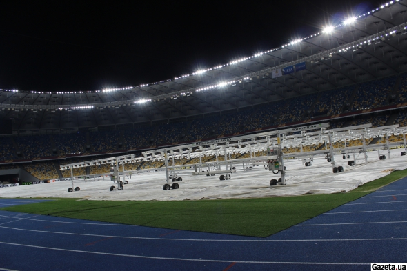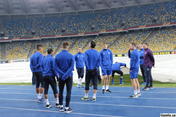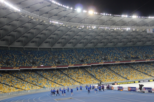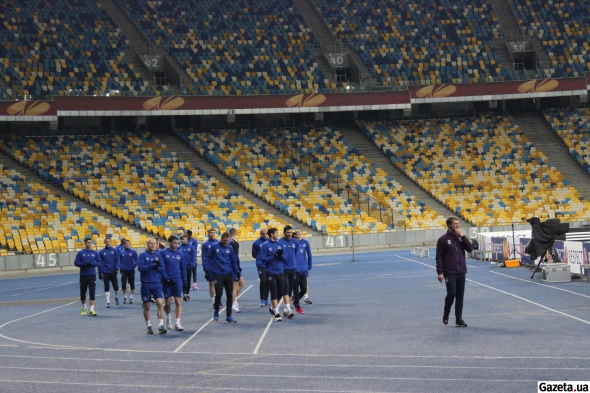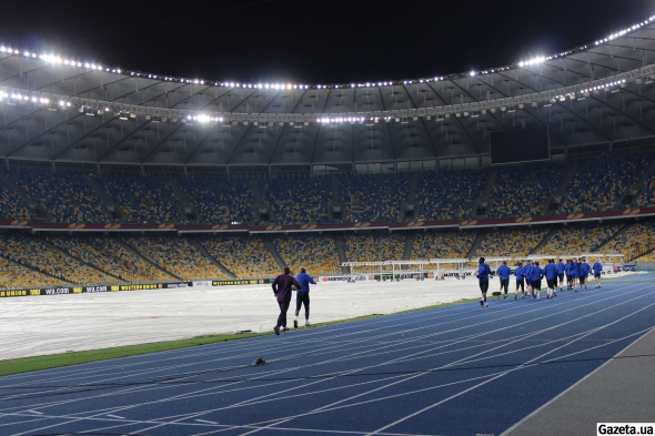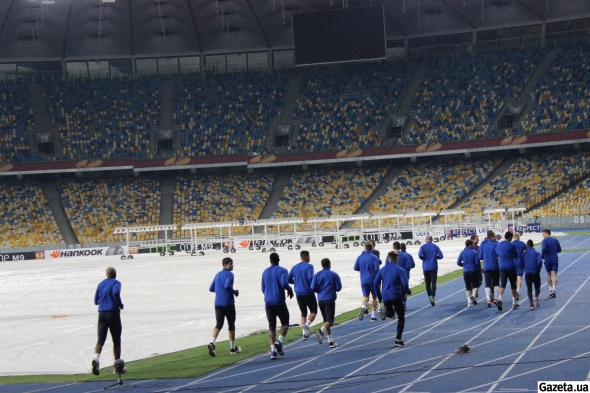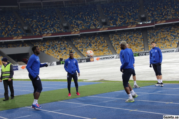 "Ириски" провели ее на беговых дорожках крупнейшей арены Украины. На тренировку игроки вышли в кроссовках и спортивной форме. Некоторые из футболистов из любопытства заглянули под покрытие, которым накрыли газон.