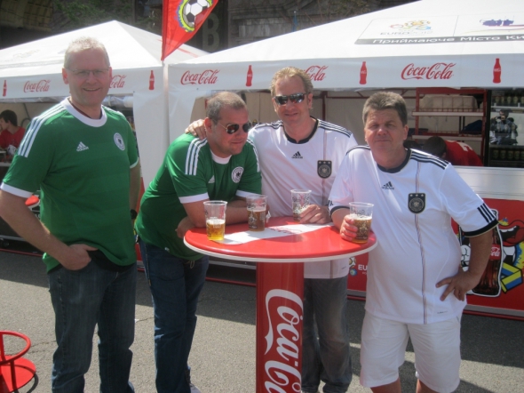 Дитер приехал в Киев из немецкого Дюссельдорфа. С тремя друзьями решили посетить матчи сборной Германии во Львове и Харькове. Пьют пиво в фан-зоне.
