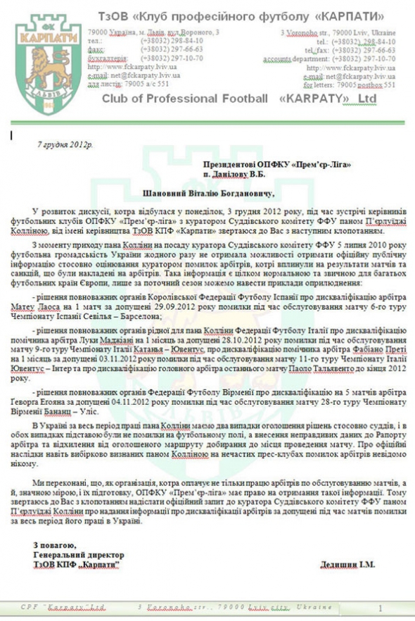 ФК "Карпаты" направили официальное рабочее письмо-обращение к Президенту ОПФКУ "Премьер-лига" Данилову В. Б. с запросом от имени Объединения получить от куратора Судейского комитета ФФУ Пьерлуиджи Коллины информацию о дисквалификации арбитра по допущенных во время матчей ошибок на протяжении периода его работы в Украине. В письме "Карпаты" привели свежие, нынешние примеры обнародования подобной информации о различных, в том числе и ведущих чемпионатах континента, "надеясь хотя бы таким образом побудить Коллину к хоть какой-то прозрачности и европейскости".