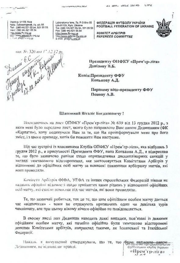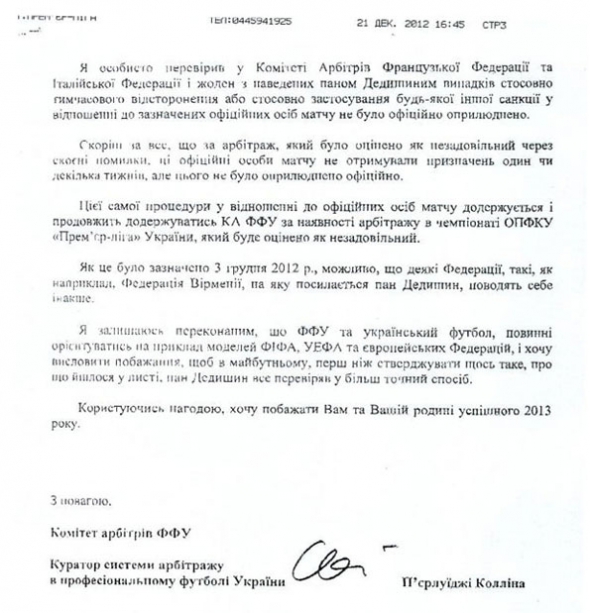 "Не будем кривить душой, утверждая, что в ответ наш клуб ожидал получить исчерпывающий ответ на поставленный вопрос. Это было бы слишком наивно. Но хоть что-то! Максимум - комментарий нескольких ситуаций, по которым господин Коллина позволил уже себе признать ошибки на немногочисленных встречах с журналистами. Минимум - отписку в стиле "мы заботимся о развитии украинского футбола, делаем для этого со своей стороны все, что в наших полномочиях, и благодарим вас за то, что вы у нас есть", или что-то подобное в стиле уже известной словесной эквилибристики. Однако ответ куратора, с которым вы можете ознакомиться ниже, превзошла наши ожидания. Она выходит за рамки делового профессионального общения, а построена в известном за пределами уважительных офисов стиле "сам дурак", - заявили во львовском клубе.