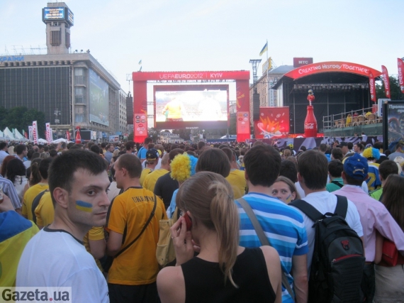 Уже на первом матче дня Англия - Франция главной площадью страны трудно было передвигаться из-за большого количества людей. Тогда их насчитывалось примерно 100 тысяч. Но уже с первых минут поединка с участием украинской сборной на Майдане негде было яблоку упасть.
