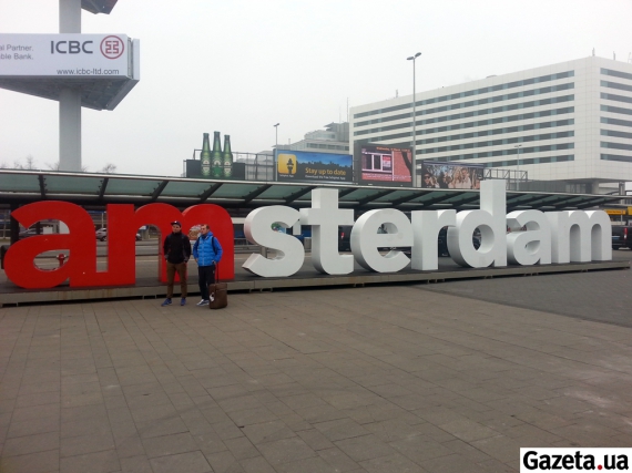 Амстердам встретил туманной и пасмурной погодой, плюс семь градусов. Еще у паспортной границы начинаешь чувствовать футбольную атмосферу столицы Нидерландов - благодаря большому лайтбокса на стене с фотографией игроков "Аякса". А чтобы случайно кто-то не забыл, куда попал, на выходе из аэропорта гостей города встречает композиция лайтбоксов, что образует название города.