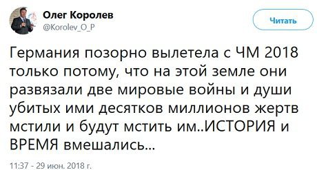 "Германия позорно вылетела из Кубка мира-2018 только потому, что на этой земле они решили две мировые войны и души убитых ими десятков миллионов жертв мстили и будут мстить им ...