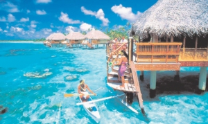Здания отелей стоят на столбах над океаном. Под ними есть трубы для канализации и водоснабжения. Электричество от солнечных батарей. Из окон можно наблюдать, как проплывают разноцветные рыбы. От дома к дому ходят по деревянным мостикам. Горничные с венками из живых цветов на лодочках развозят завтраки по домам.