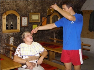 Пирушка Киш разговаривает с туристами через переводчика. Однако персонал погреба немного понимает украинский. Этого достаточно, чтобы выбрать и купить вино.