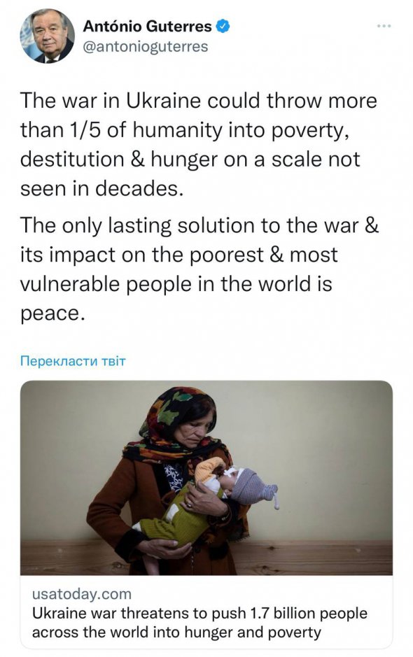 Полномасштабное вторжение России вызовет нужду и голод в масштабах, невиданных десятилетиями, заявил генсек ООН Антониу Гутерриш в Twitter.