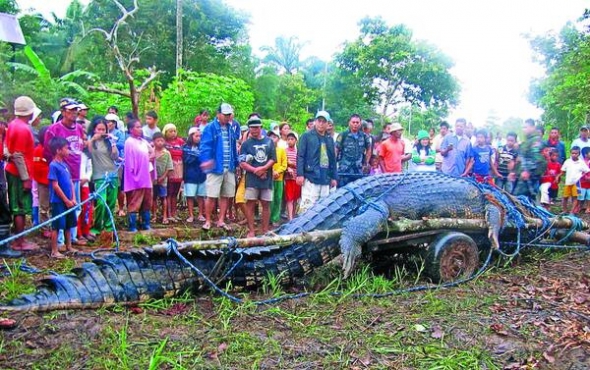 В заливе возле филиппинского поселка Бунаван поймали крокодила длиной 6,5 м. Рептилию весом больше тонны тянули на берег 100 местных крестьян. 20 лет они боялись подойти к берегу, так как гигантский хищник часто нападал на людей и скот.