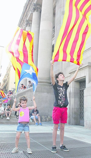 Люди с каталонскими желто-красными флагами прошли к дому регионального парламента. Они заполнили центр города.
